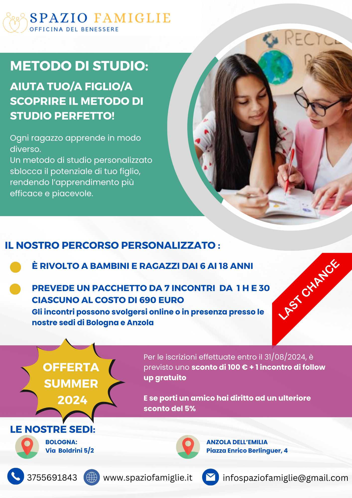 Per questo abbiamo creato un pacchetto di 7 incontri (ciascuna da 1h e mezza) che potranno essere effettuati online (e quindi anche se siete in vacanza!) oppure in presenza presso le nostre sedi di Bologna e Anzola.
